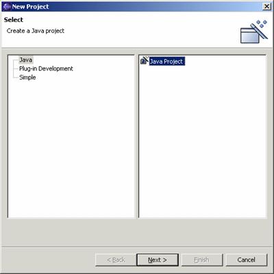 To import the exercises, once Eclipse has loaded, create a new project by selecting File -> New -> Project. A wizard will appear, as shown below. Ensure Java Project is selected then click Next.
