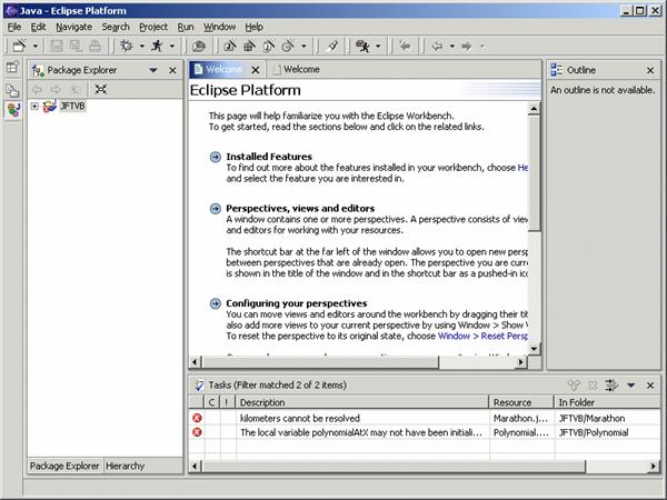 Also notice the tasks view in the bottom-right of the screen. This reports that two compilation errors currently exist in the project. These will be resolved as part of the exercises.
